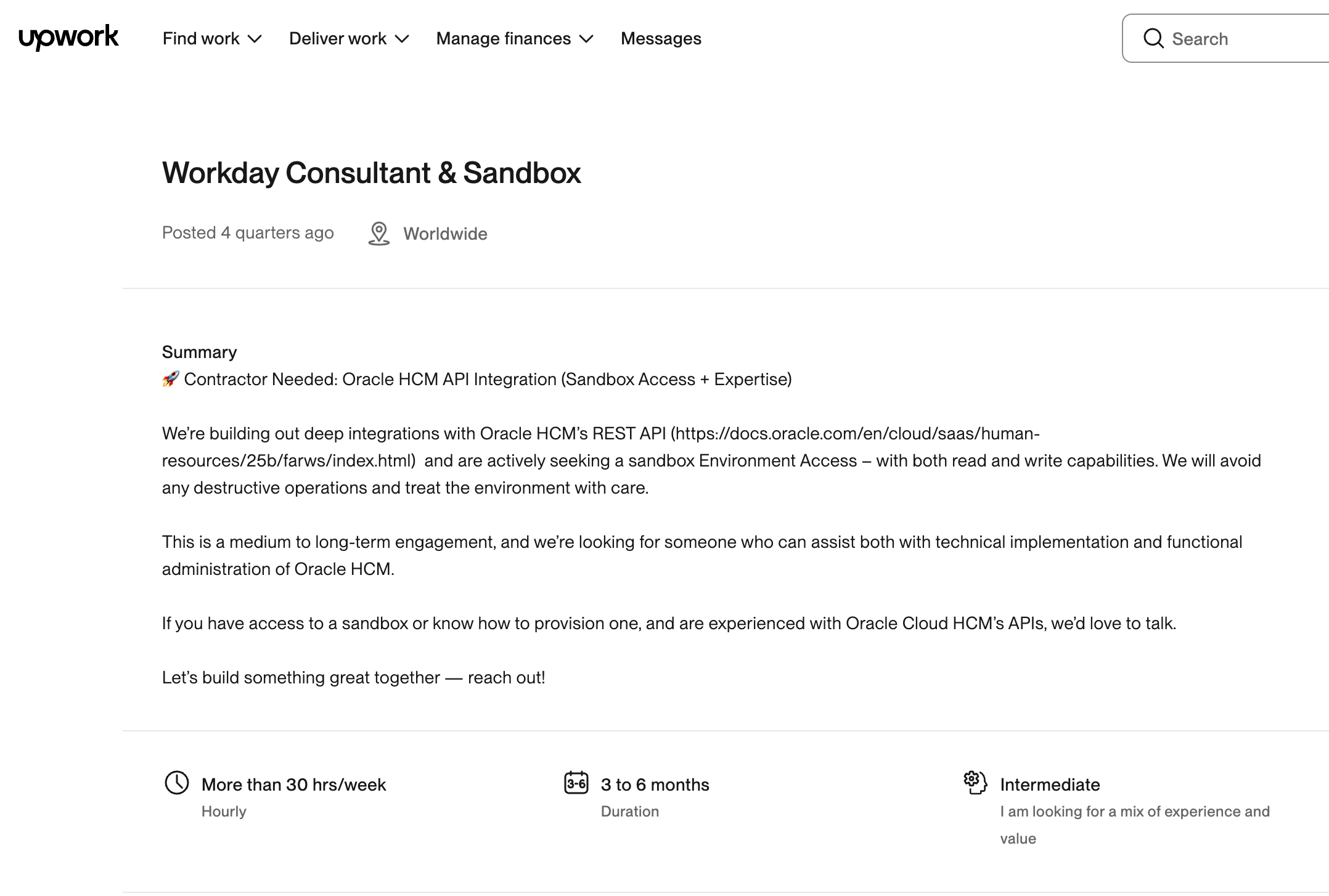 We had success finding a Workday consultant with sandbox access through a post like this on Upwork: