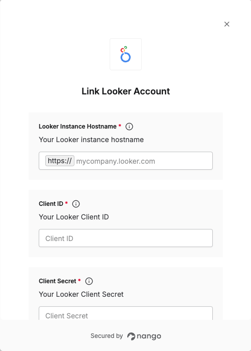 Once you have your Looker Instance Hostname, Client ID, and Client Secret:- Open the form where you need to authenticate with Looker.