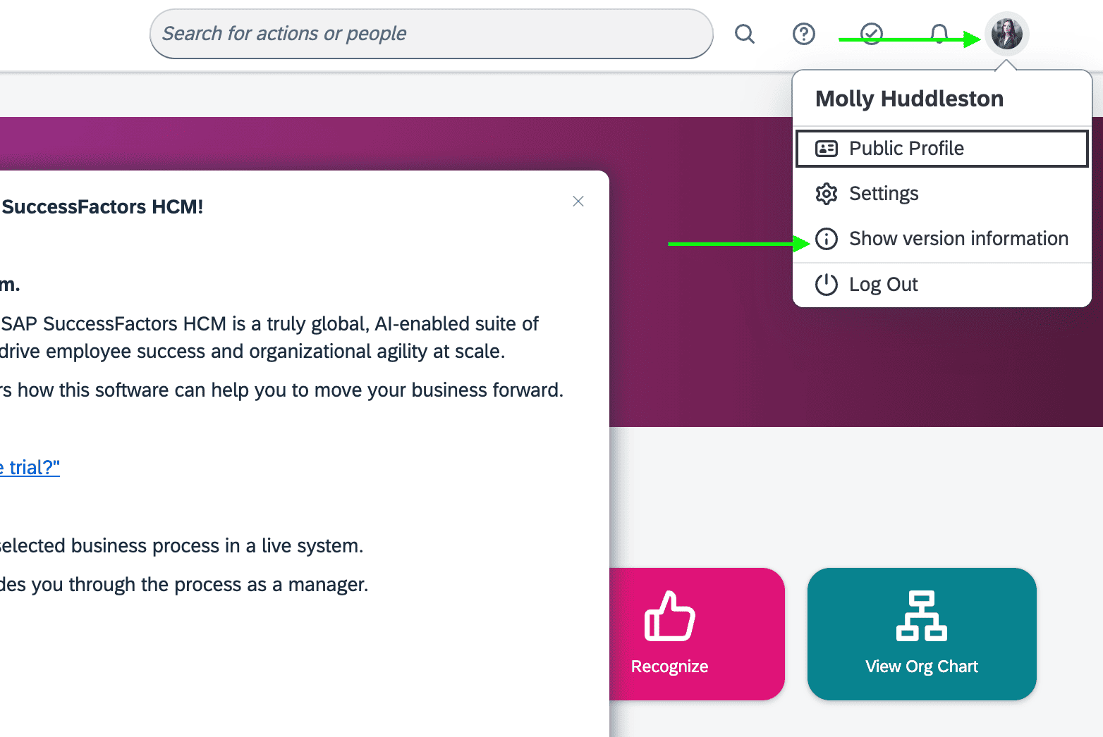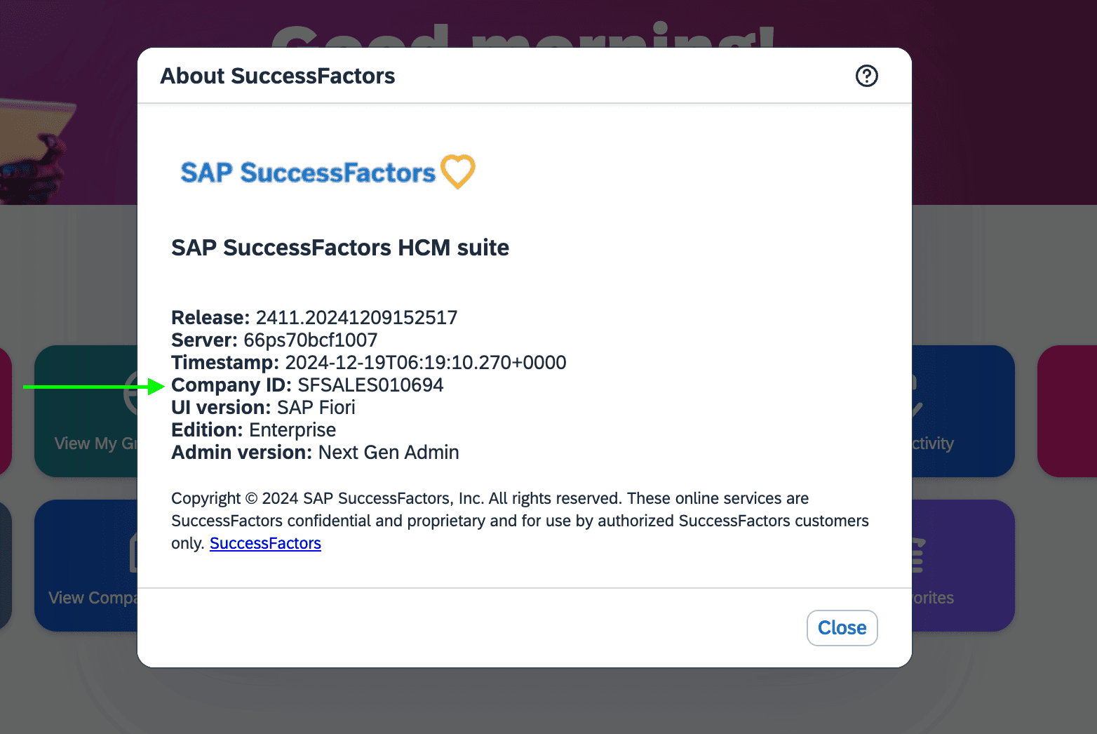 - To find your SAP SuccessFactors Company ID, in the same dropdown menu, click Show version information. Locate Company ID in the modal that pops up: