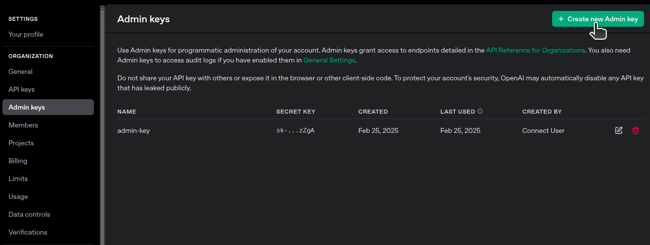 To connect your OpenAI Administration account, you need to authenticate using an Admin Key. This key allows you to access OpenAI’s Administration APIs for programmatic administration of your account, and more. Note Admin keys cannot be used for non-administration endpoints. This guide will help you retrieve your Admin key and set up the connection.Prerequisites