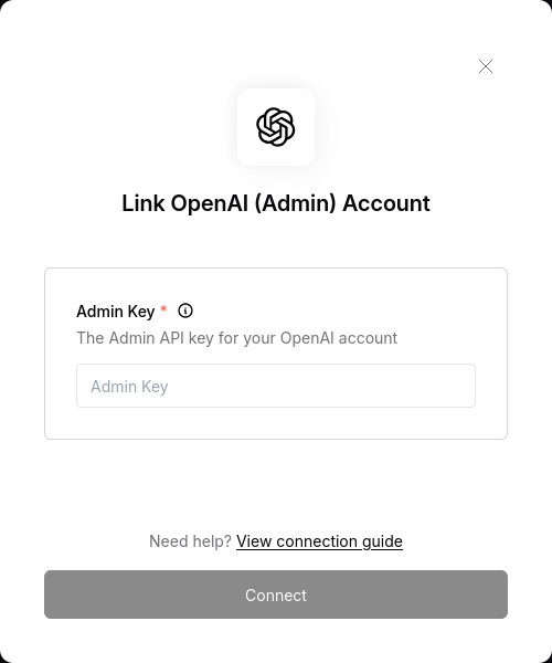 To authenticate with OpenAI, you need to provide your Admin key. Follow these steps to connect:- Go to the OpenAI connection form in the integration setup.
